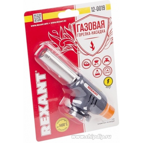 Газовая горелка-насадка REXANT GT-19 с пьезоподжигом. Благодаря наличию пьезоподжига, такой горелкой удобно пользоваться одной рукой. Отличается от других горелок серии кнопкой пьезоподжига, объединенной с вентилем регулировки подачи газовой смеси. Для инициации пьезоподжига нужно нажимать на вентиль. Рекомендуется для работы с термоусаживаемыми трубками, перчатками, муфтами; для плавления и сварки изделий из пластиков и стекла; удаления краски; обработки поверхностей на производстве и в лабораторных условиях; для разморозки замков, водопроводных труб, продуктов; для копчения продуктов или карамелизации десертов; для украшения процесса подачи блюд; для работ в саду и огороде, для быстрого и экологичного поджига дров, угля.