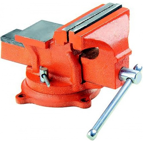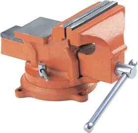 Нерабочие поверхности тисков окрашены, съемные губки выполнены рельефно, есть наковальня для проведения ударных слесарных операций.Тиски можно повернуть относительно основания, выбирая наиболее удобное положение, и закрепить.