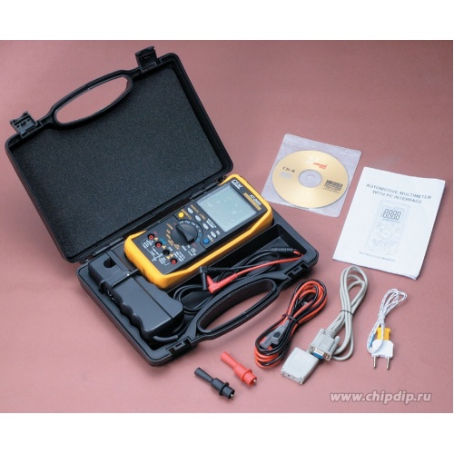 кейс, прибор, щупы, руководство пользователя, термопара K-типа, индуктивный датчик, USB кабель, ПО, элемент питания 9 В типа Крона.