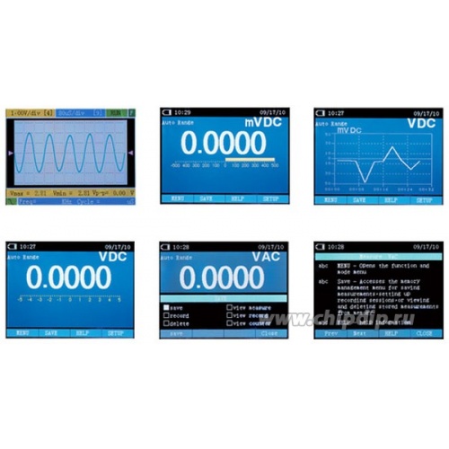 Дисплей 3.5" 320x240 TFT, Полоса пропускания: 10МГц, Частота дискретизации 50 MS/s, Интерфейс Bluetooth, режим мультиметра: TrueRMS U пост/перем 1000В, I пост/перем 10A, измерение сопр. 50МОм, частоты 10МГц, ёмкости 10мФ, термопара тип К, ЖК-дисплей 50000 отсчетов,