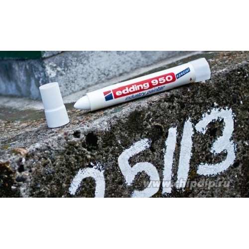 Корпус промышленного маркера изготовлен из прочного пластика. В маркере Edding 950 в качестве маркирующего вещества используется высокостойкая пигментная, плотно ложащаяся мастика. Мастика застывает через несколько секунд после ее нанесения на маркируемую поверхность.