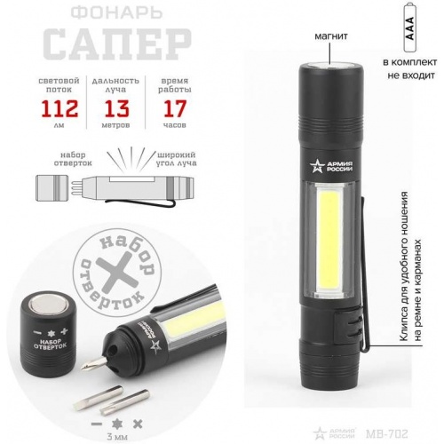 Описание Фонарь MB-702 АРМИЯ РОССИИ универс. Сапер COB 1.5Вт алюм. отвертки; магнит; клипса 1хААА блист. ЭРА Б0030200
