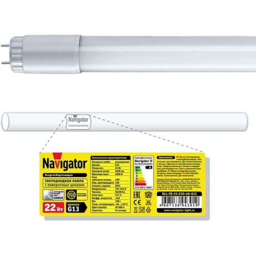 Navigator NLL-T8 – светодиодная энергосберегающая лампа общего освещения. Колба лампы цилиндрическая, матовая. Лампа ...Navigator NLL-T8 – светодиодная энергосберегающая лампа общего освещения. Колба лампы цилиндрическая, матовая. Лампа NLL-T8 повторяет форму и размеры стандартных линейных люминесцентных ламп Т8 и идеально подходит к любому светильнику, в котором используются данные типы ламп.