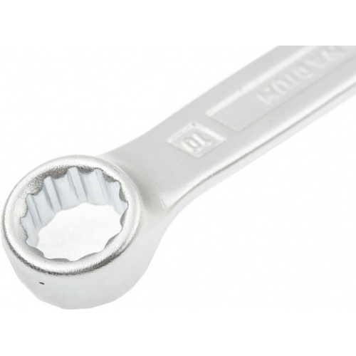 Ключ размером 10 мм с одной стороны оснащен рожковым типом захвата (открытым зевом) и накидным (кольцевым) с другой стороны.
