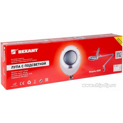 Лупа на струбцине круглая настольная 8Х с подсветкой с крышкой, белая REXANT предназначена для визуального увеличения различных мелких предметов или их фрагментов. Она используется в косметологии, при выполнении ювелирных и радиомонтажных работ, при ремонте часов, в биологии и медицине, для организации труда людей со слабым зрением, а также для других работ, где требуется дополнительное увеличение и подсветка рабочего поля. Такая оптическая система состоит из линзы, удобного пантографического механизма и бестеневой подсветки.