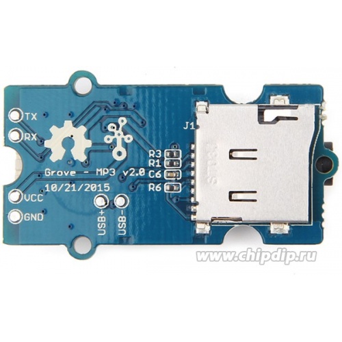 Встраиваемый аудио модуль на базе чипа WT5001 - поддерживает 8-44.1кГц дискретизацию частоты MP3 и WAV форматов. На плате расположены несколько периферийных портов: стандартный UART Grove интерфейс, разъем для наушников, выводы выхода правого и левого канала, интерфейс для micro SD карт. Состояние воспроизведения и поиска файлов можно контролировать, посылая команды через последовательный порт.