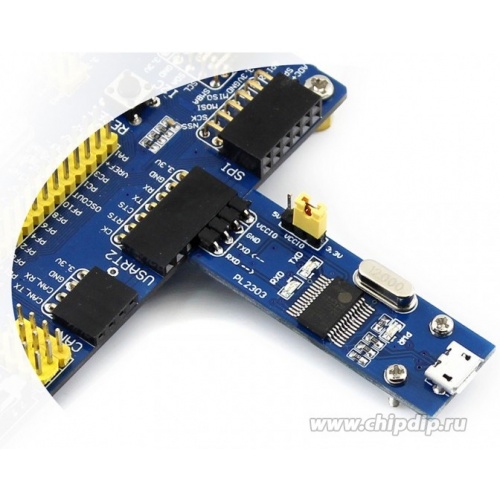 Плата преобразователя интерфейса USB-UART на базе конвертера PL2303 с разъемом microUSB. На плате установлены три светодиода для индикации сигналов TXD, RXD и наличия питания. С помощью джампера можно выбрать выходной уровень напряжения питания 3.3В или 5В.