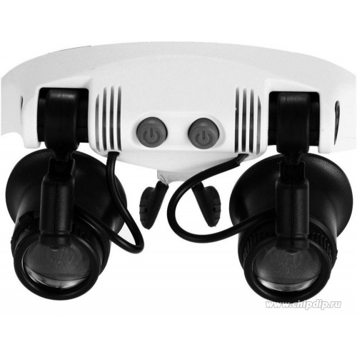Лупа налобная очки со сменными бинокулярными линзами и подсветкой. Увеличение: 10x/15x/20x/25x. 3 комплекта сменных б...Лупа налобная очки со сменными бинокулярными линзами и подсветкой. Увеличение: 10x/15x/20x/25x. 3 комплекта сменных бинокулярных линз для каждого глаза в комплекте могут быть легко установлены для нужного увеличения. Светодиодная подсветка (2 суперярких светодиода) позволяет работать в условиях недостаточной освещенности. Подобная налобная лупа незаменима для слабовидящих людей при чтении, работе с мелкими предметами. Лупа позволяет не занимать руки и рассматривать предметы на разной кратности (сменные линзы). Сферы применения такой лупы обширны: чтение, радиотехнические и ювелирные работы, часовые работы, медицина. Характеристики: Увеличение – 10x/15x/20x/25x. Питание – 3 батарейки LR03 (AAA) (мизинчиковые, в комплект не входят). Подсветка – 2 суперярких светодиода. Габариты – 150х110х70мм. Вес без батареек – 85 г. Материал – пластик. Страна-производитель – Китай. Незаменимый инструмент для тех, кому нужно разглядеть мелкие детали изображения или текста.